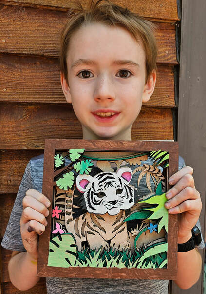 "Watching my 4 yr-old granddaughter and 7 & 9 yr-old grandsons unleash their imaginations to design their own layered creations was a joy. They each began with a tiger kit, but the end results were completely unique for each child. The layered designs captured their attention in ways a coloring book cannot, the results were quality art to decorate their rooms. ALL ages worked quietly together for extended periods of time. I'd highly recommend these kits for any parent or grandparent (& you just might find yourself wanting to paint a kit yourself)!"