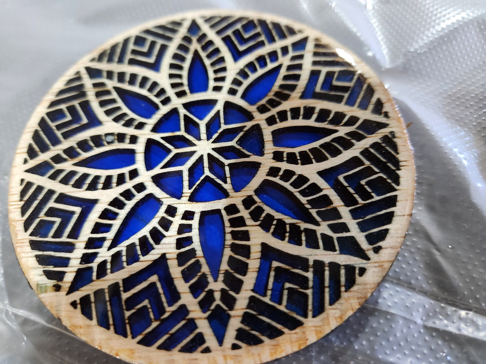Handcrafted intricate laser-cut coasters with vibrant tinted resin inlay. Measures 4" in diameter, the perfect size for glasses. mugs, cans, or bottles.